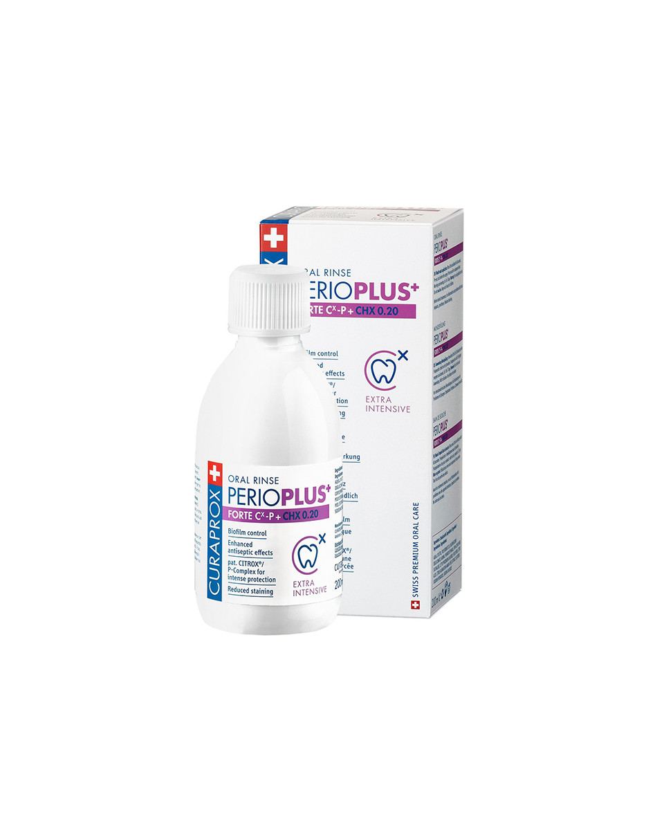 Koncentrácia chlorhexidínu (CHX) v ústnej vode Perio Plus+ Forte je 0,2%. Je veľmi vhodná na krátkodobé používanie a po invazívnych zákrokoch v ústnej dutine. Je spoľahlivá a vysoko účinná.